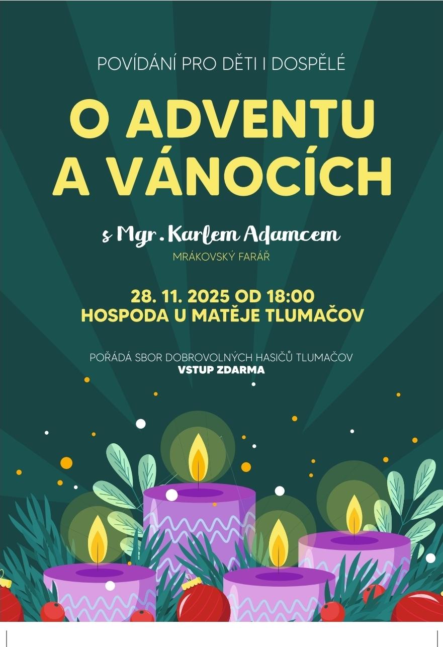 SDH Tlumačov zve na povídání o Adventu a Vánocích s Mrákovským farářem Mgr. Karlem Adamcem, které se koná v pátek 28. 11. od 18:00 v hospodě U Matěje. Vstup zdarma.
